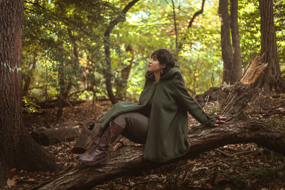 Flared raglan sleeve coat, inspired by The Lord of the Rings movies, featuring a deep hood, pointed shoulders, and lacing details on the arms. Made of 100% forest green wool.